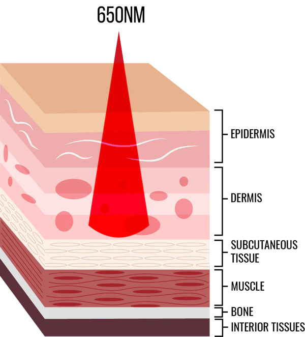 - Difference Between 650nm and 808nm: hundreds of clinical studies enhanced cellular red light therapy function. 660 nm is readily absorbed by skin tissue, leading to improved skin health and collagen production. Near infrared light at 850 nm is invisible to the human eye and penetrates deeper into tissue, leading to benefits like increased muscle recovery and reduced joint pain, arthritis, knee, muscle spasms, shoulder pain, etc.NOTE: THE CENTRAL LIGHT OF 808NM IS INVISIBLE.