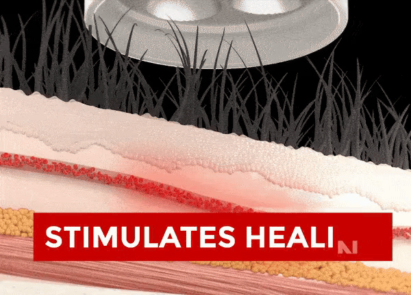 Red light penetrates the skin at the surface and muscular tissue levels. It works by getting the cells in the area to reproduce faster. This causes healthy new cells to emerge and replace the old damaged cells. It also increases the flow of nutrient-rich blood in the area which leads to faster cell regeneration.