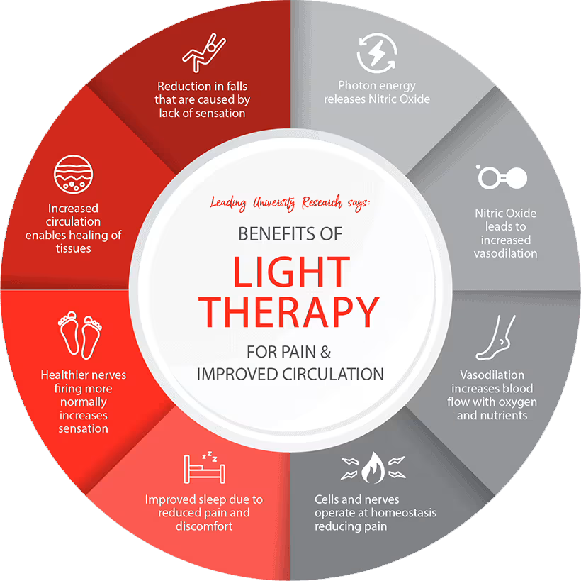 Light therapy assists in reducing inflammation, promoting circulation, and supporting tissue repair in the legs and ankles, leading to decreased discomfort and enhanced mobility.