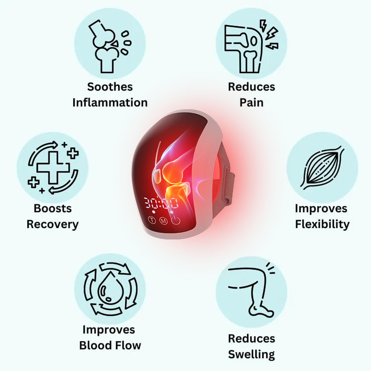 - RED LIGHT KNEE MASSAGER: This knee massager ontains different wavelengths (630nm, 660nm, 880nm). Effective in knee arthritis, soft tissue injuries, sports injuries, and reduces inflammation and capillary rupture.